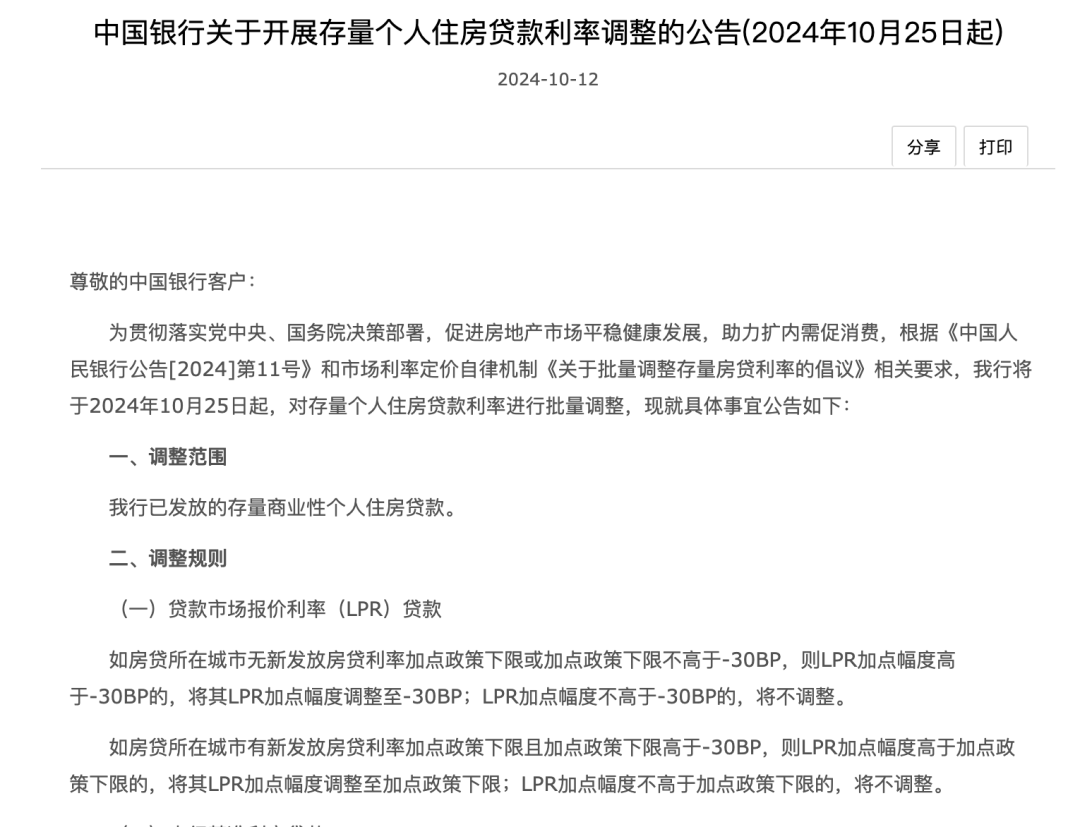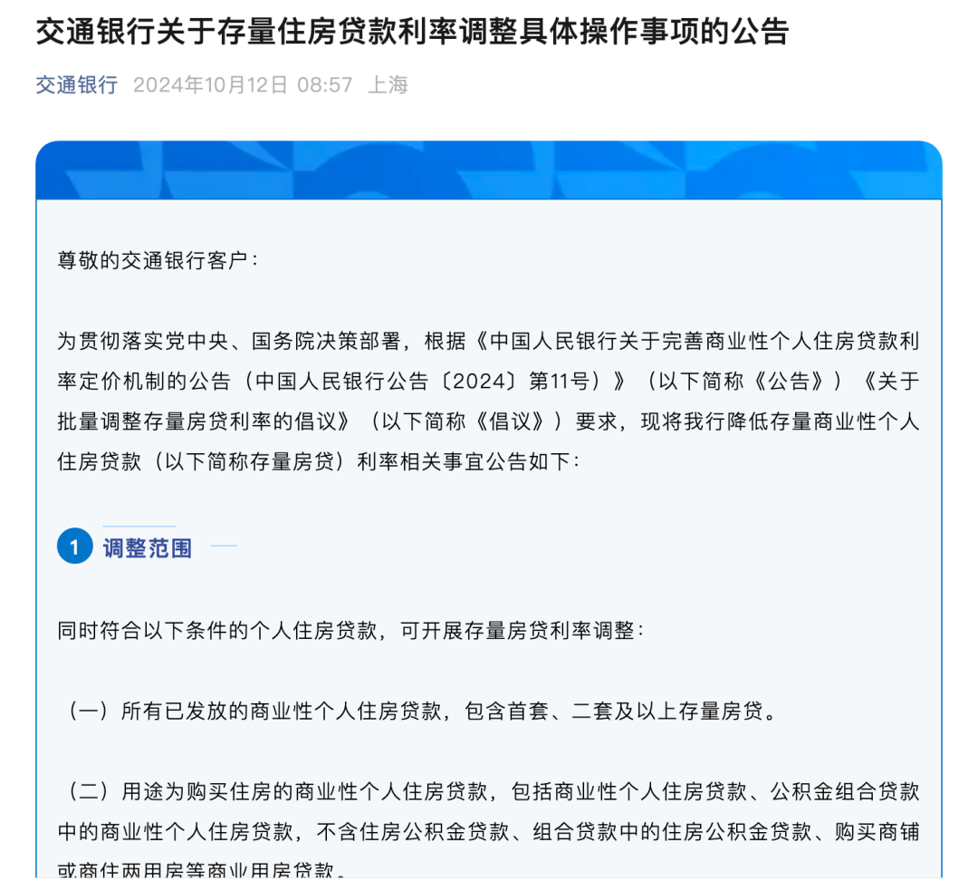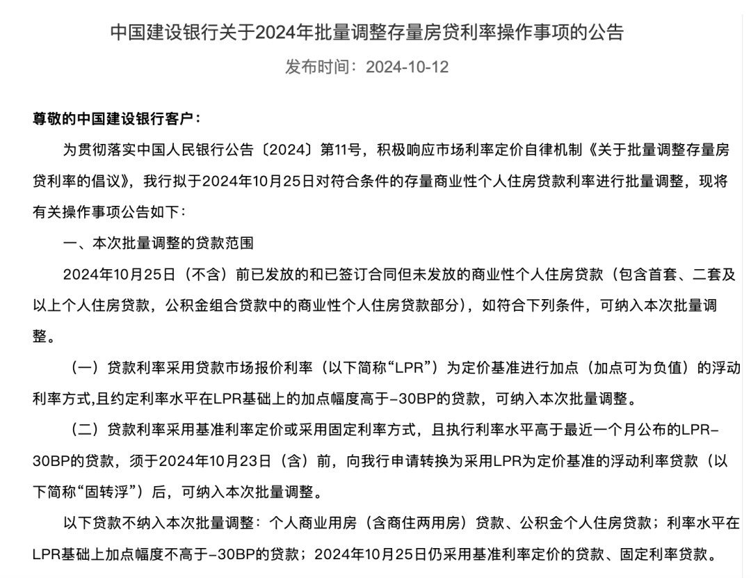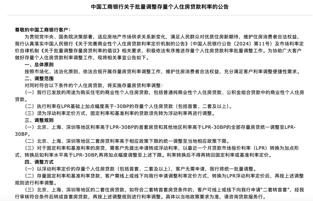 今天(12日),工商银行、农业银行、中国银行、建设银行、交通银行等多家银行陆续发布公告,10月25日起,将对存量个人房贷利率进行批量调整。除贷款在北京、上海、深圳等地区且为二套房贷款的情形外,其他符合条件的房贷利率都将调整为贷款市场报价利率LPR-30BP。多家银行明确,存量房贷利率调整将由银行统一进行批量调整,不需要客户提出申请。如果贷款人的存量房贷利率已经低于贷款市场报价利率LPR-30BP,将不会进行调整。而对于固定利率存量房贷,则需要先行转换为贷款市场报价利率LPR加减点的浮动利率,之后银行就会直接进行调整。对有逾期房贷的客户,不在这次批量调整中。关于存量房贷利率调整