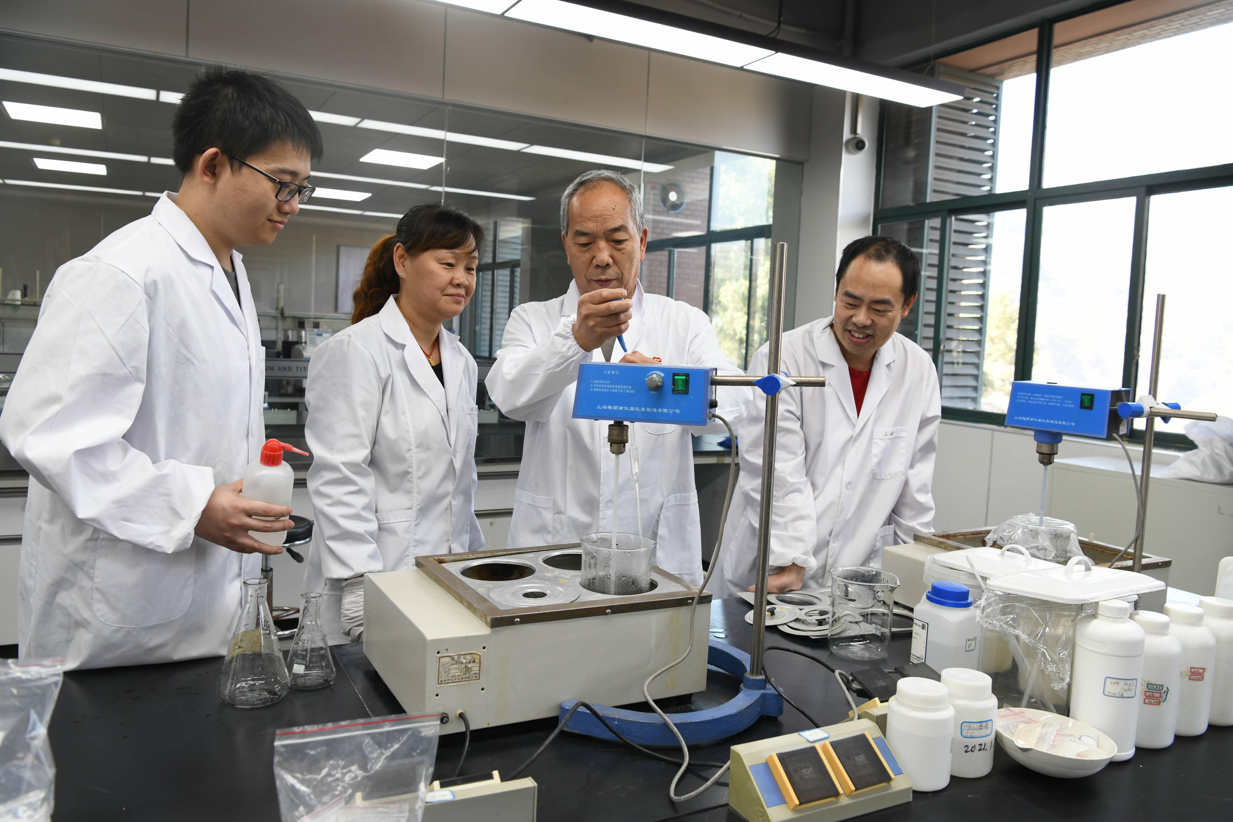 鞍钢首届科学家杨仰军在钒钛资源综合利用国家重点实验室指导团队成员开展钛精矿酸浸实验 攀研院供图